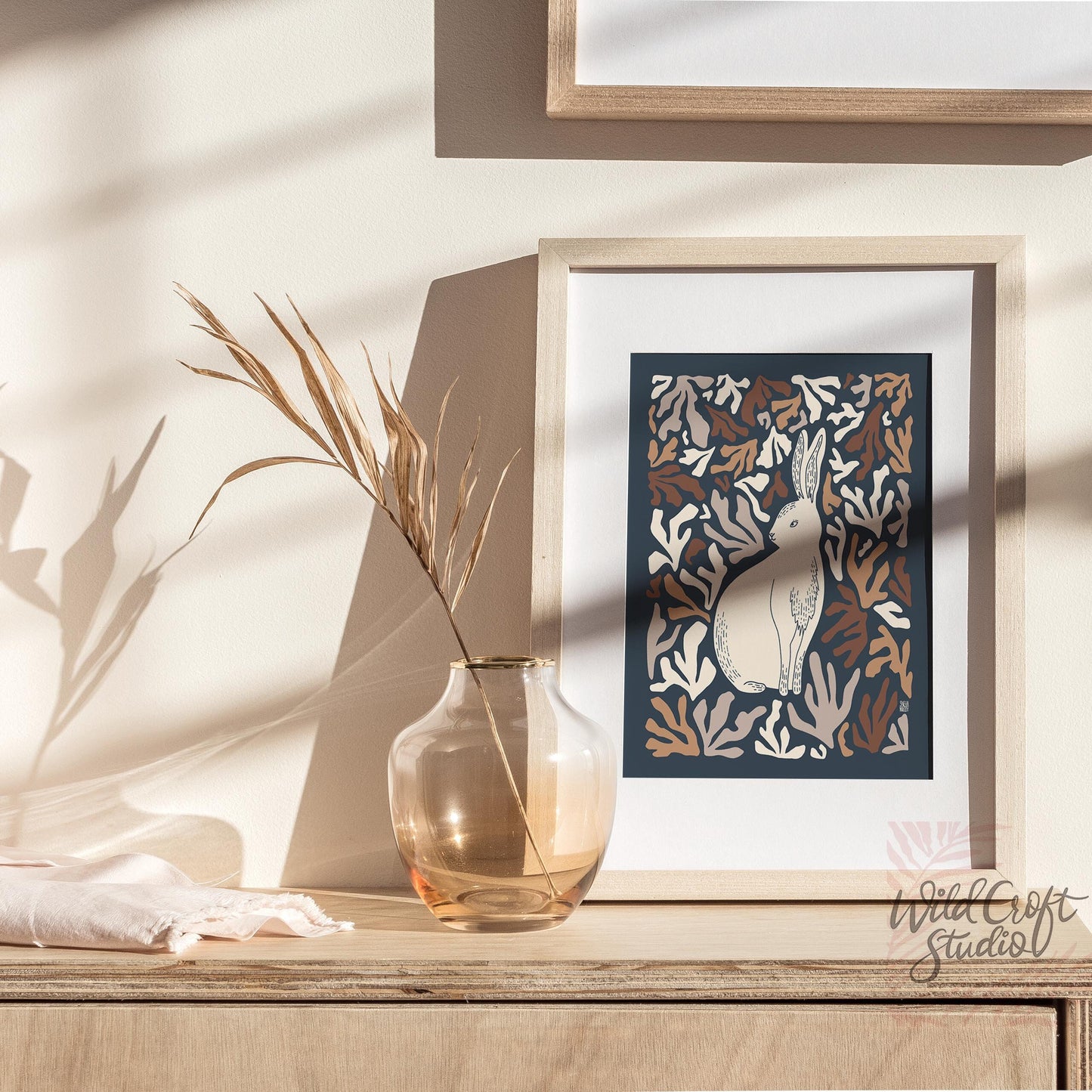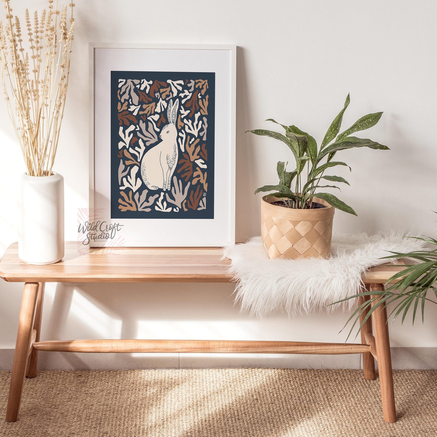A darling little bunny curled up in a graphic Forest art print, printed on bright, matte fine art paper. This animal illustration features a Hale Navy color palette, with beautiful muted neutrals that is Perfect for modern Matisse graphic style lovers, urban kids and tween’s room decor, rabbit lovers etc. Would make an excellent addition over the crib for a sleepy baby!